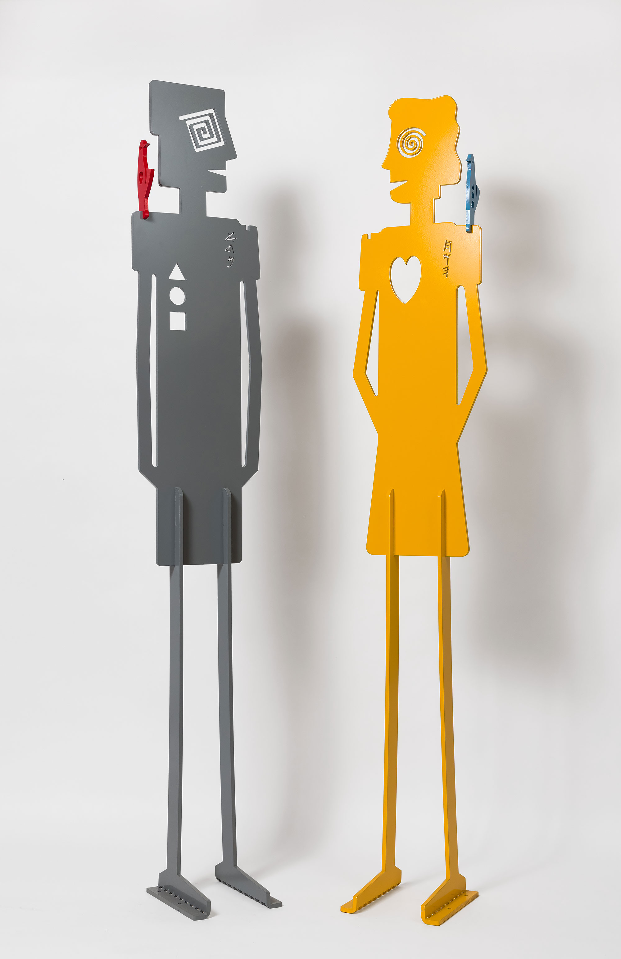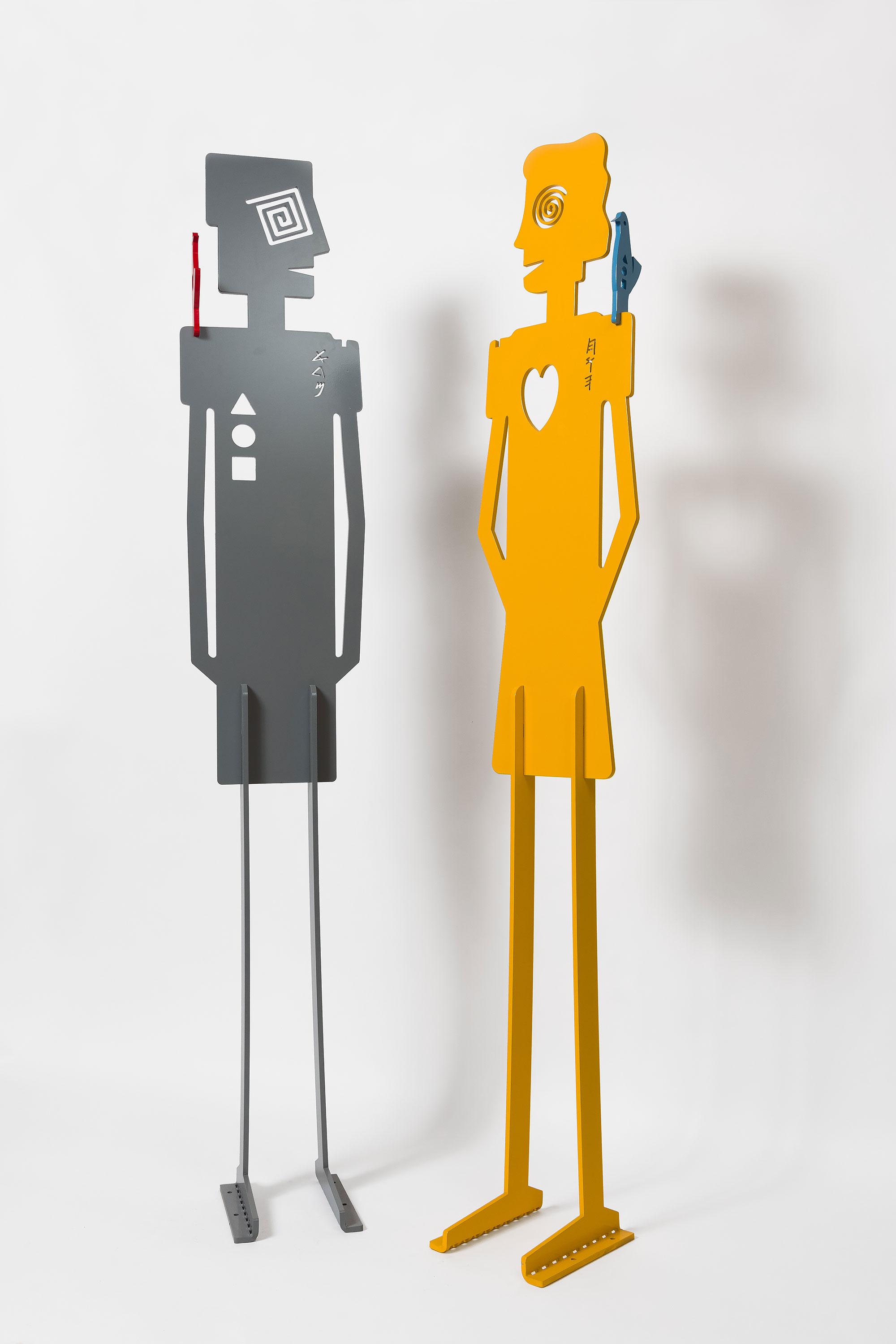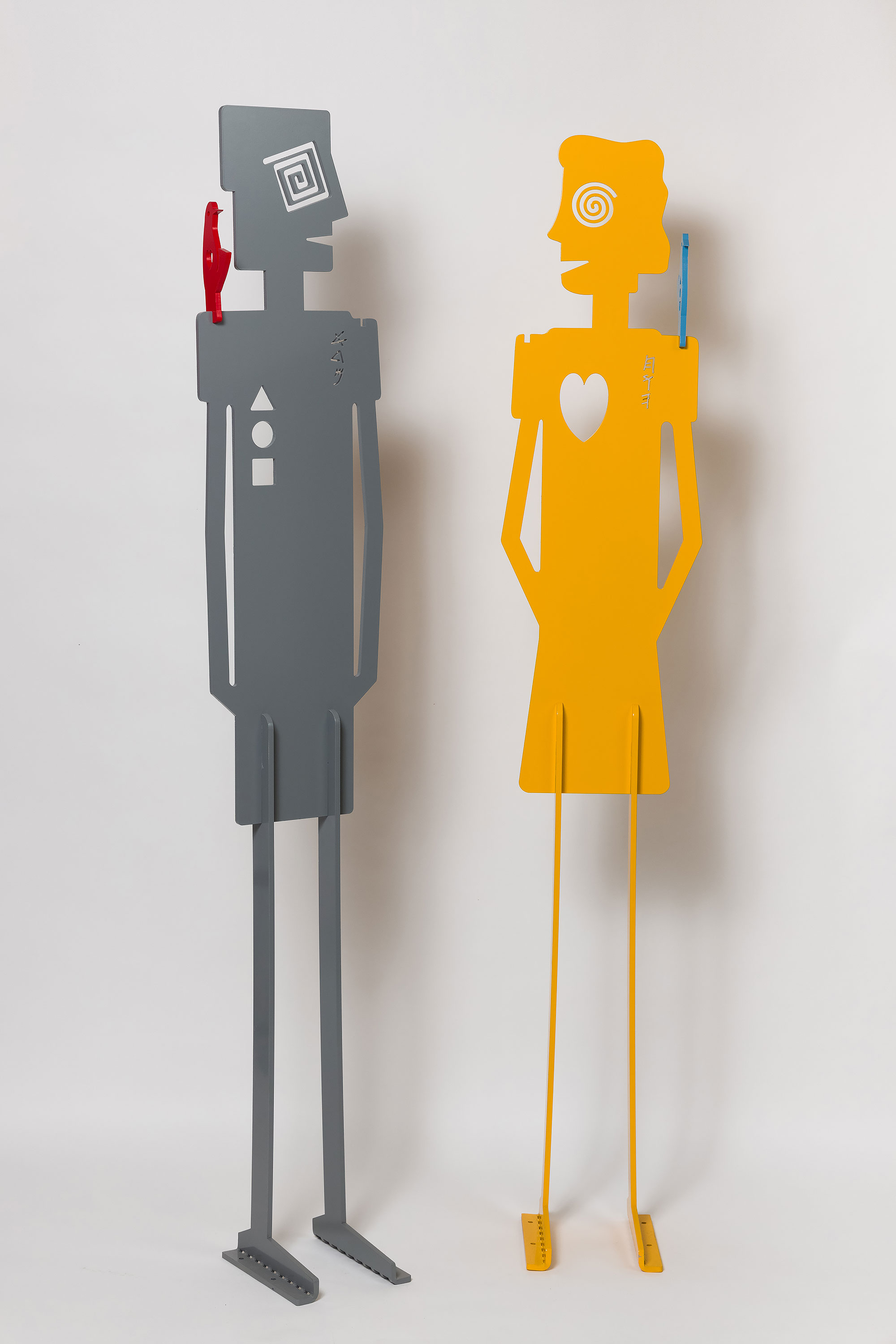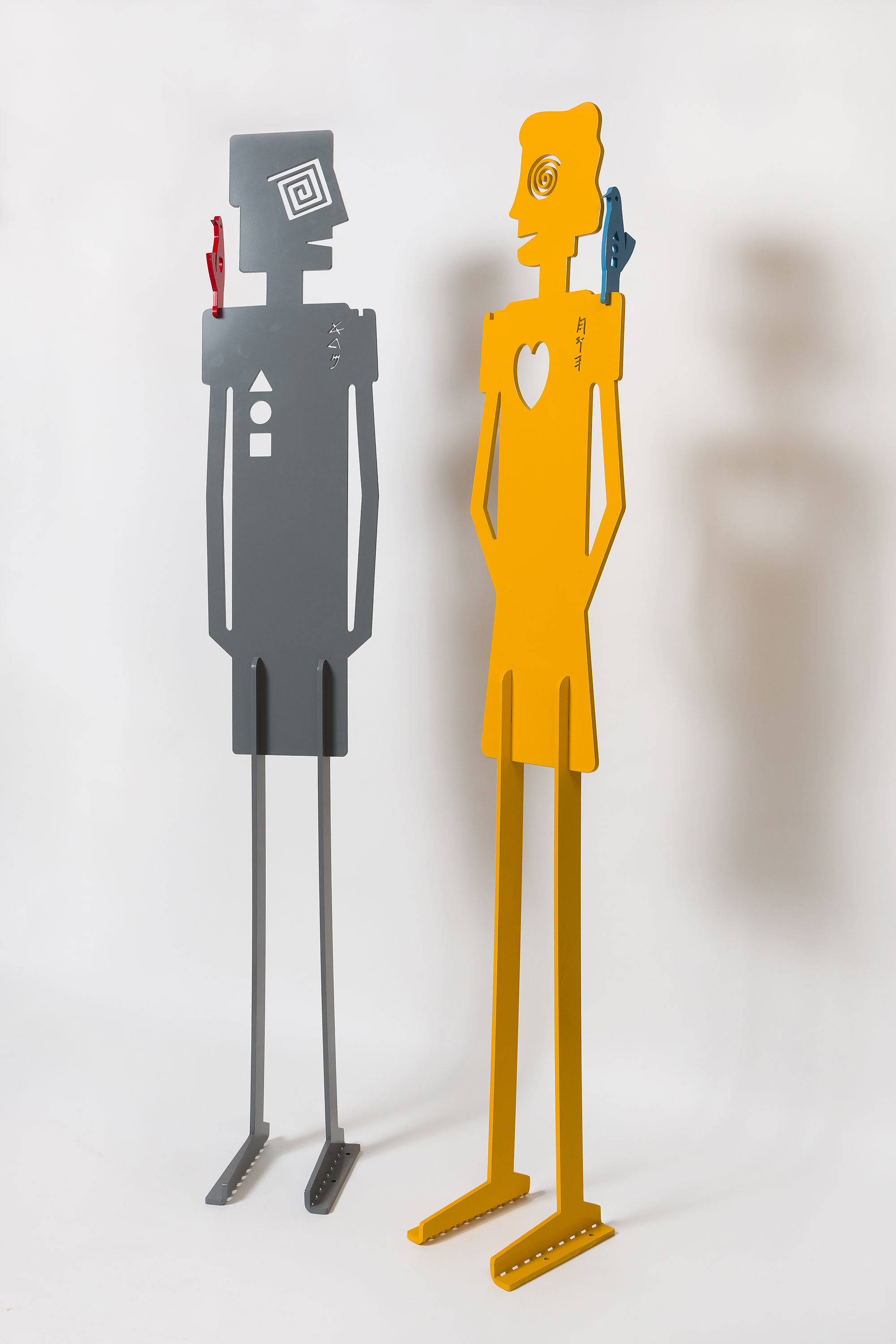 A striking and unique 3D sculpture titled ‘Adam & Eve’, crafted with original automobile colors on aluminum. Each piece stands at approximately 203 x 35 cm (Eve) and 206 x 35 cm (Adam), making them suitable for both indoor and outdoor display. This artwork is a fusion of pop art and modern art influences, drawing inspiration from the Bauhaus movement, pop art icons, and ancient scripts. This piece reflects the artist distinctive style and storytelling passion, bridging the past and present, making it a special and exciting addition to any collection.
