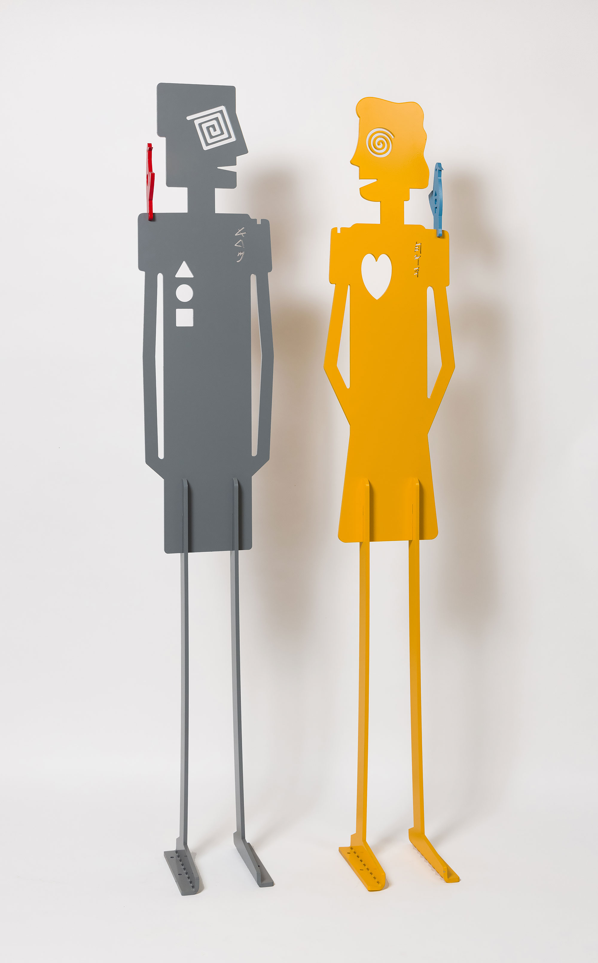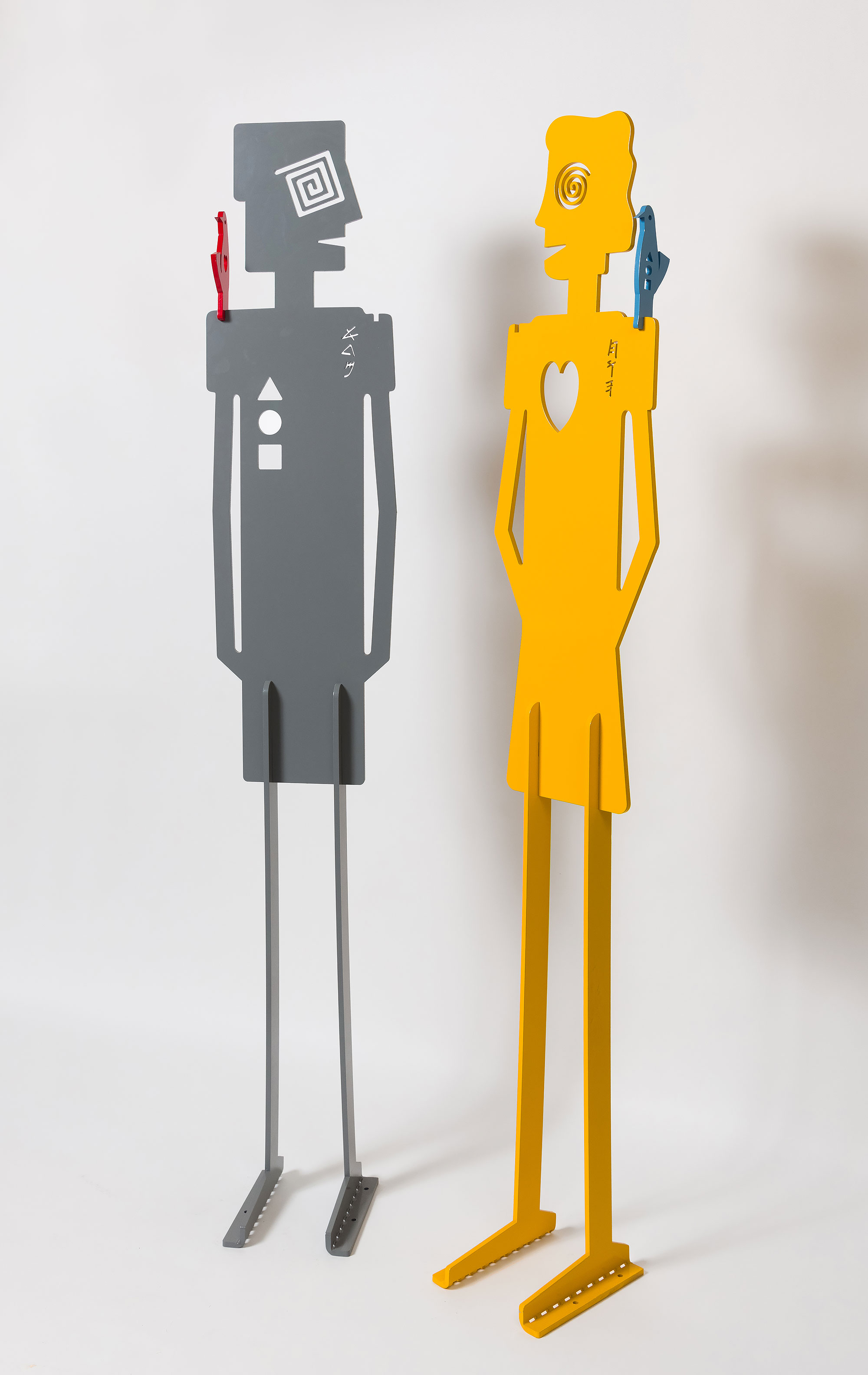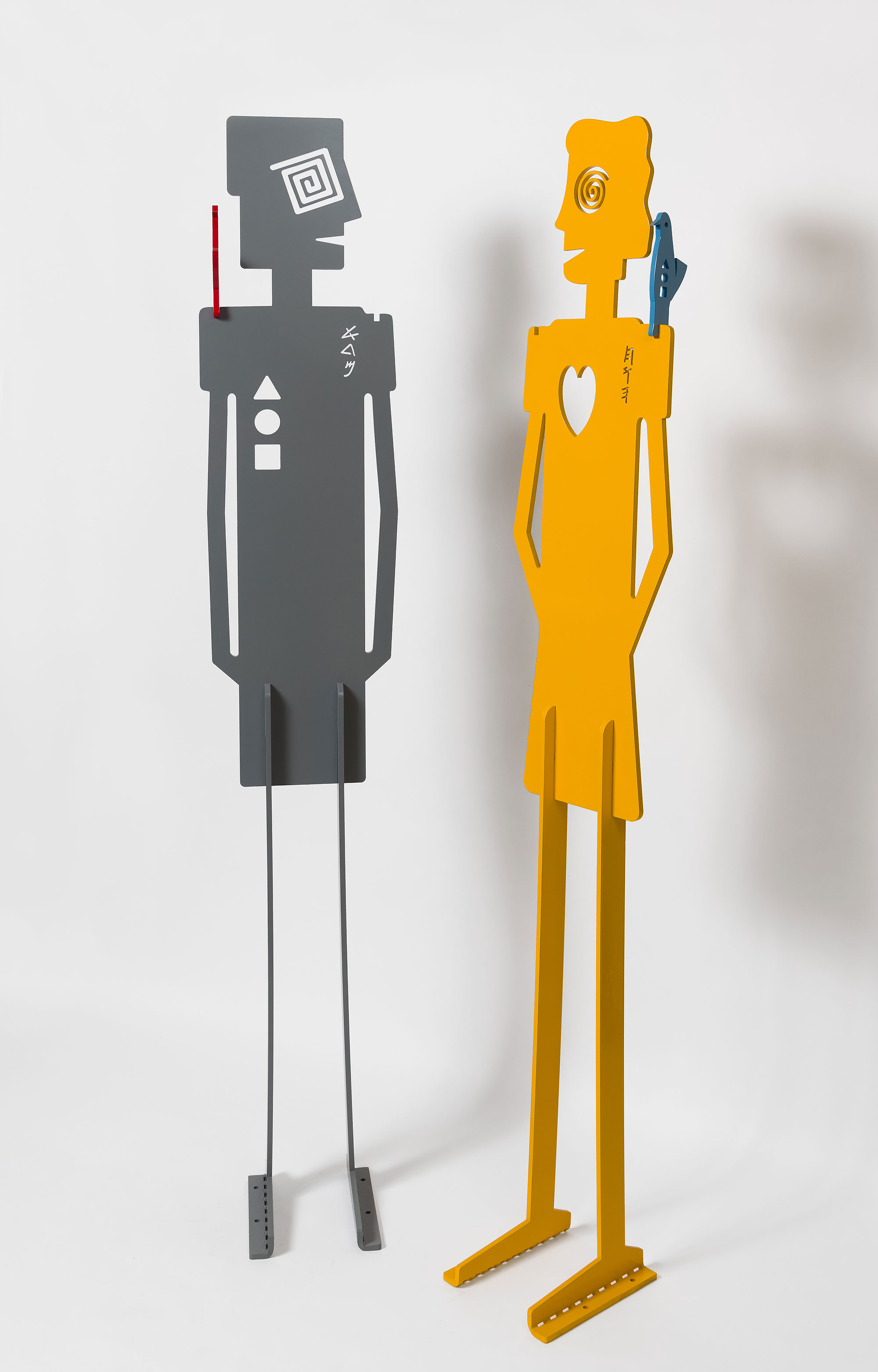 A striking and unique 3D sculpture titled ‘Adam & Eve’, crafted with original automobile colors on aluminum. Each piece stands at approximately 203 x 35 cm (Eve) and 206 x 35 cm (Adam), making them suitable for both indoor and outdoor display. This artwork is a fusion of pop art and modern art influences, drawing inspiration from the Bauhaus movement, pop art icons, and ancient scripts. This piece reflects the artist distinctive style and storytelling passion, bridging the past and present, making it a special and exciting addition to any collection.