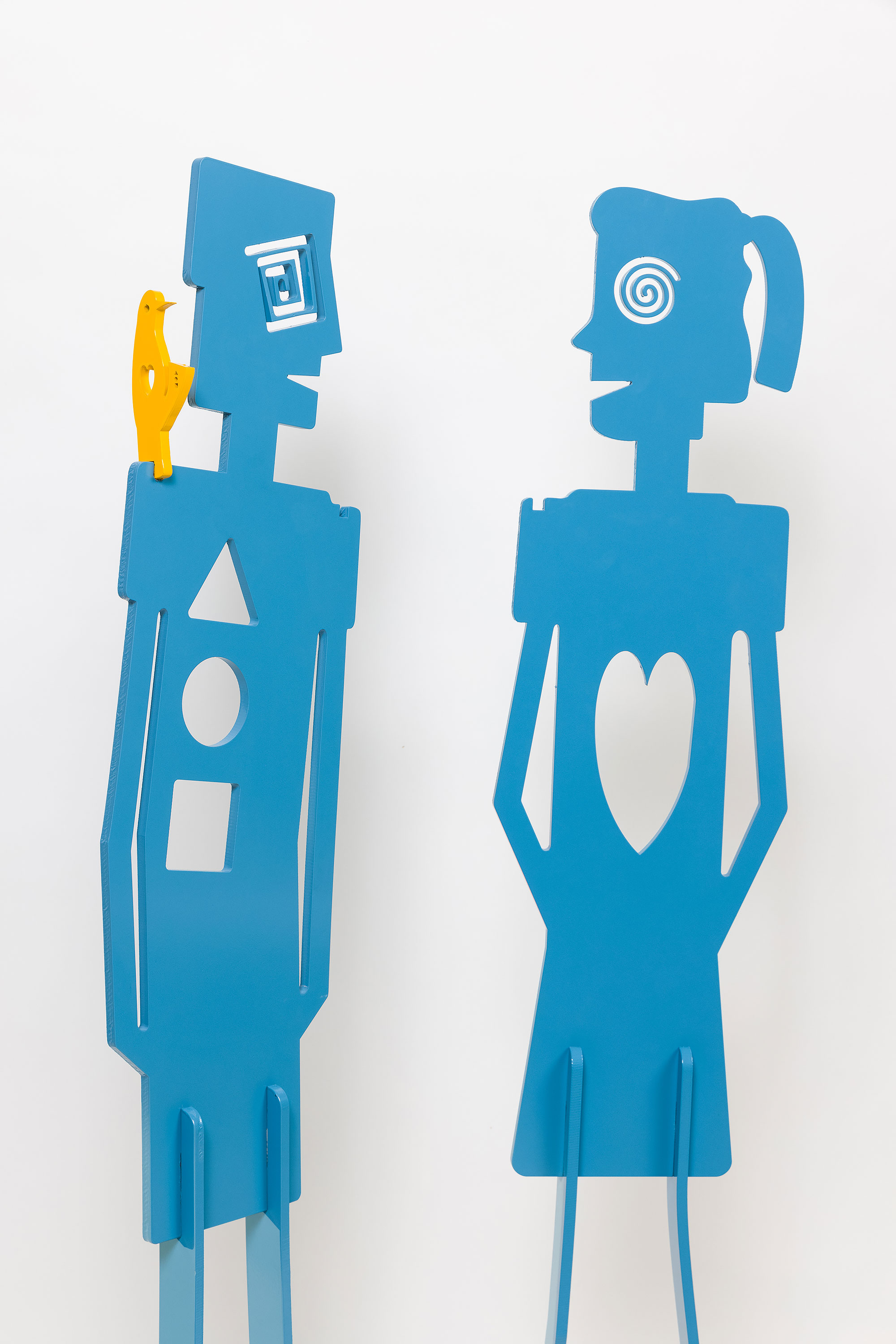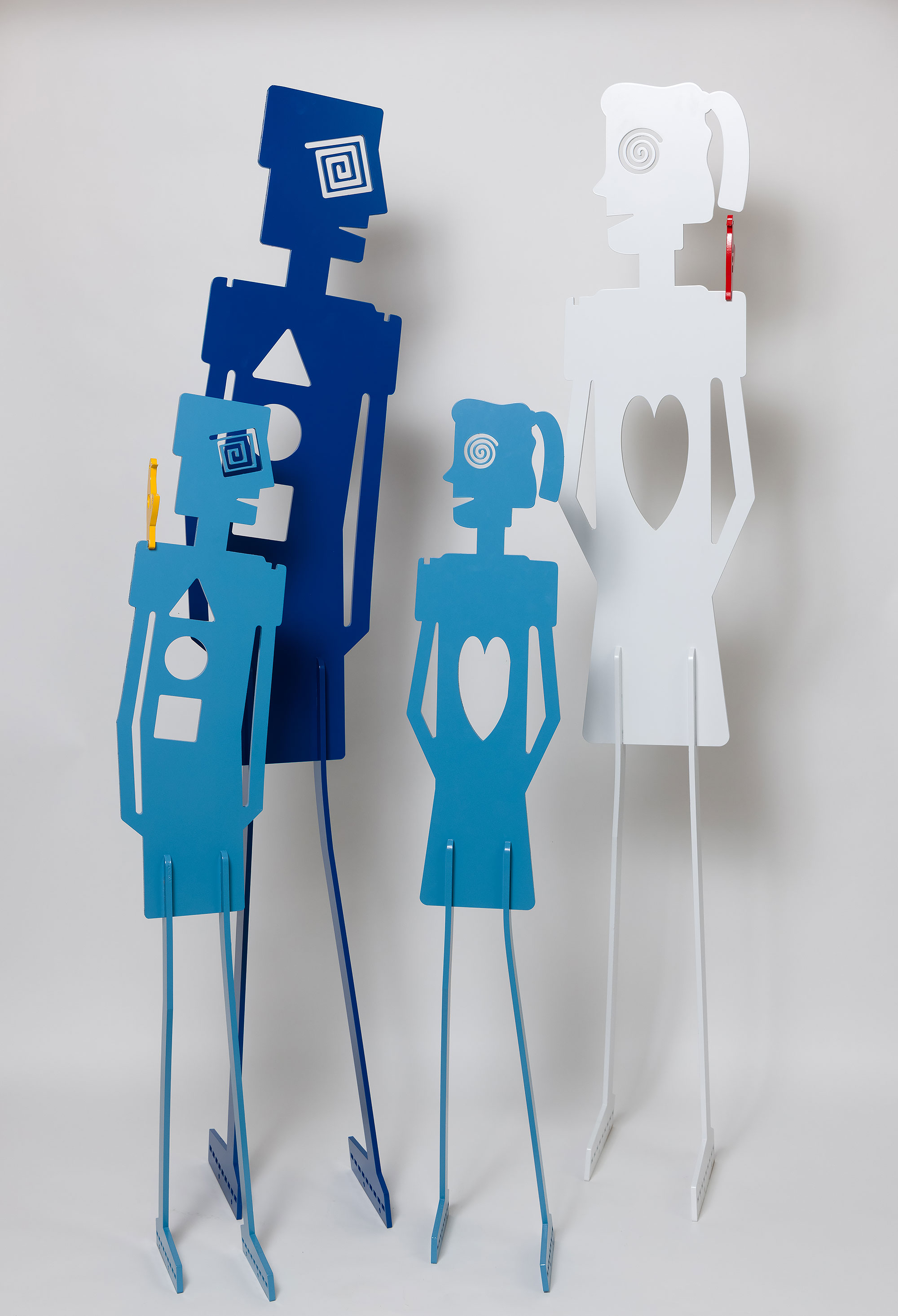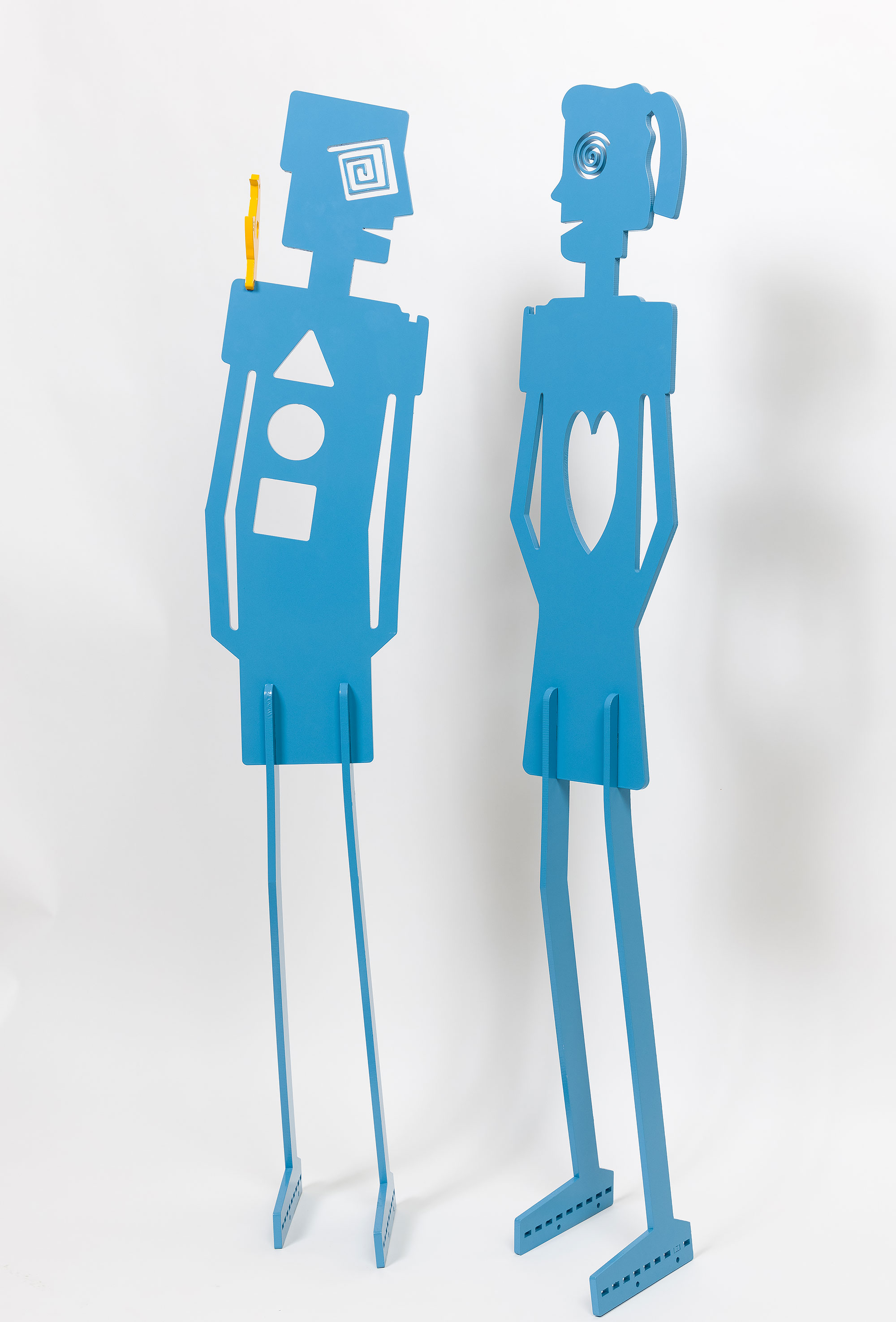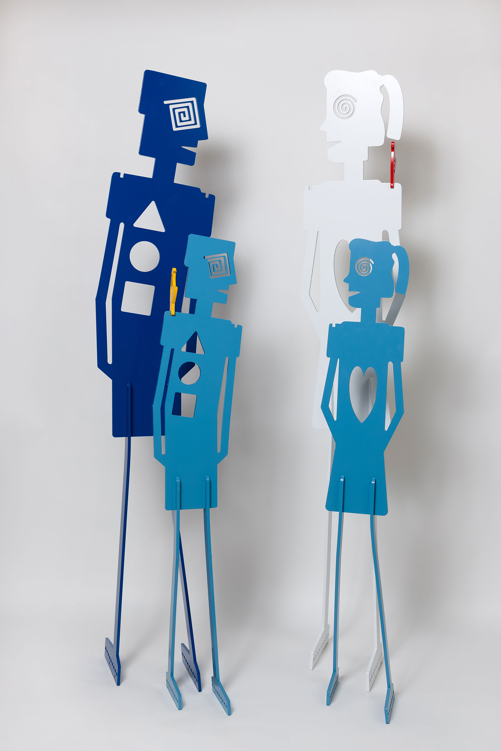 A striking and unique 3D sculpture titled ‘Boy & Girl’, crafted with original automobile colors on aluminum. Making them suitable for both indoor and outdoor display. This artwork is a fusion of pop art and modern art influences, drawing inspiration from the Bauhaus movement, pop art icons, and ancient scripts. This piece reflects the artist distinctive style and storytelling passion, bridging the past and present, making it a special and exciting addition to any collection.