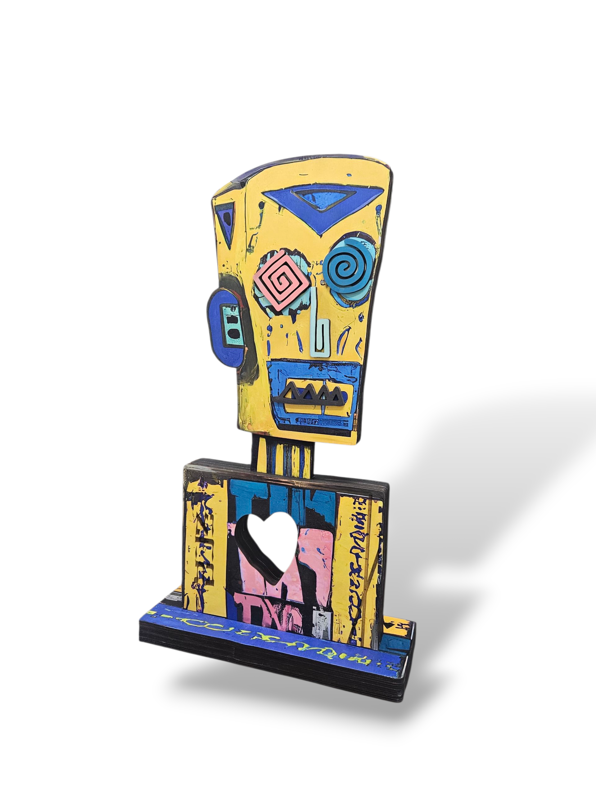 A vibrant, pop-art inspired piece blending Bauhaus geometry with playful funk. Crafted from wood with layered colors, dynamic patterns, and a heart-shaped cutout, this sculpture radiates bold energy and soulful character. A celebration of identity and creativity, it brings color, curiosity, and heart to any space, by Zion Ezri.