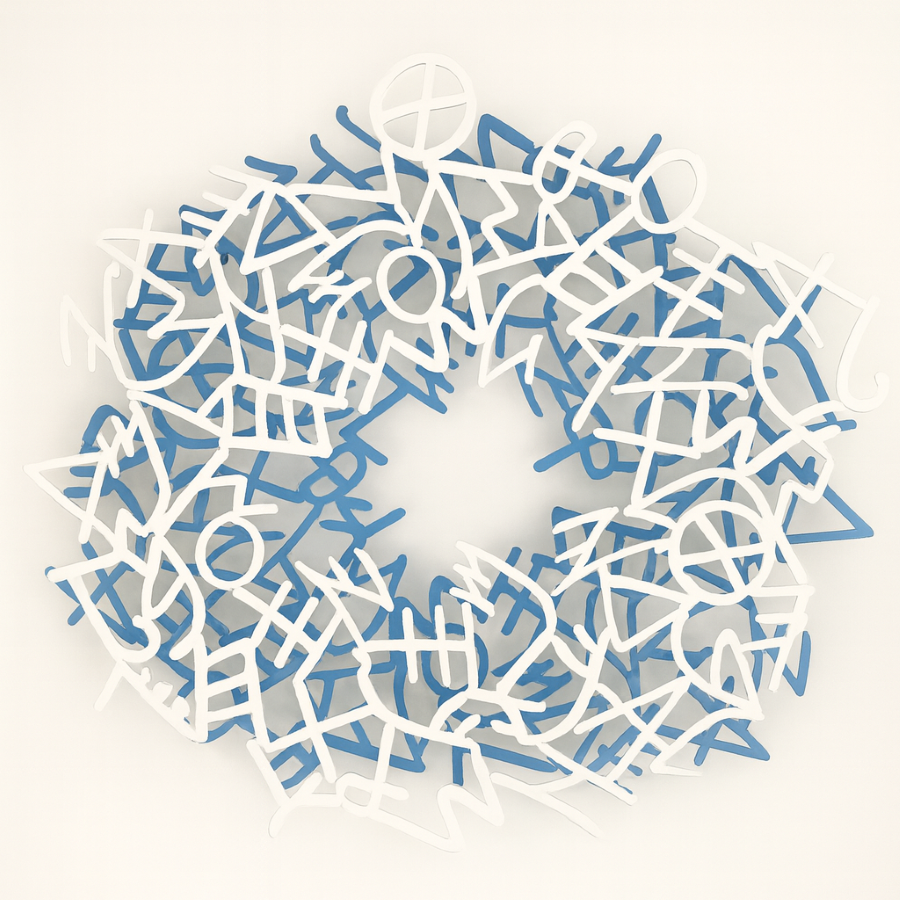 Genesis is a powerful three-dimensional wall sculpture inspired by the ancient Hebrew alphabet, composed of layered aluminum forms coated with original automobile colors. The interwoven abstract characters create movement, harmony, and a sense of creation unfolding—echoing the essence of the word Genesis.