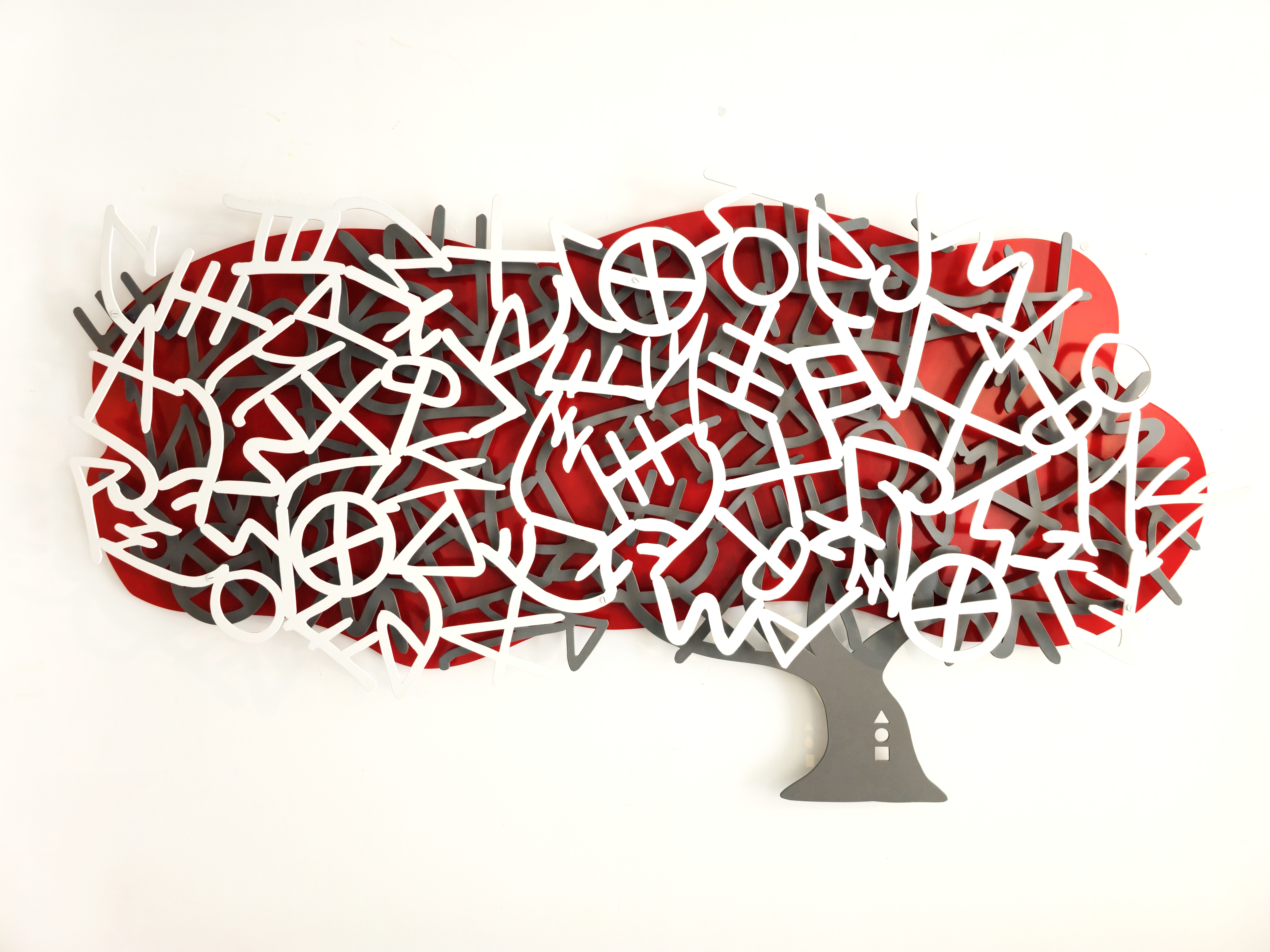 Tree of Life is a dynamic three-dimensional wall sculpture composed of interwoven forms inspired by the ancient Hebrew alphabet. Precision-cut aluminum elements, finished with original automobile colors, create layers of movement and rhythm that evoke growth, continuity, and spiritual vitality.