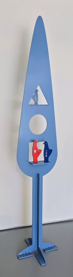 This blew totem-like piece evokes both the essence of a tree and the spirit of renewal. Perched within its bold, stylized form are minimalist bird figures—guardians of memory, perched in unity and hope. The clean lines and bright palette echo Zion Ezri’s deep connection to Bauhaus aesthetics, pop art vibrancy, and urban sculpture.
